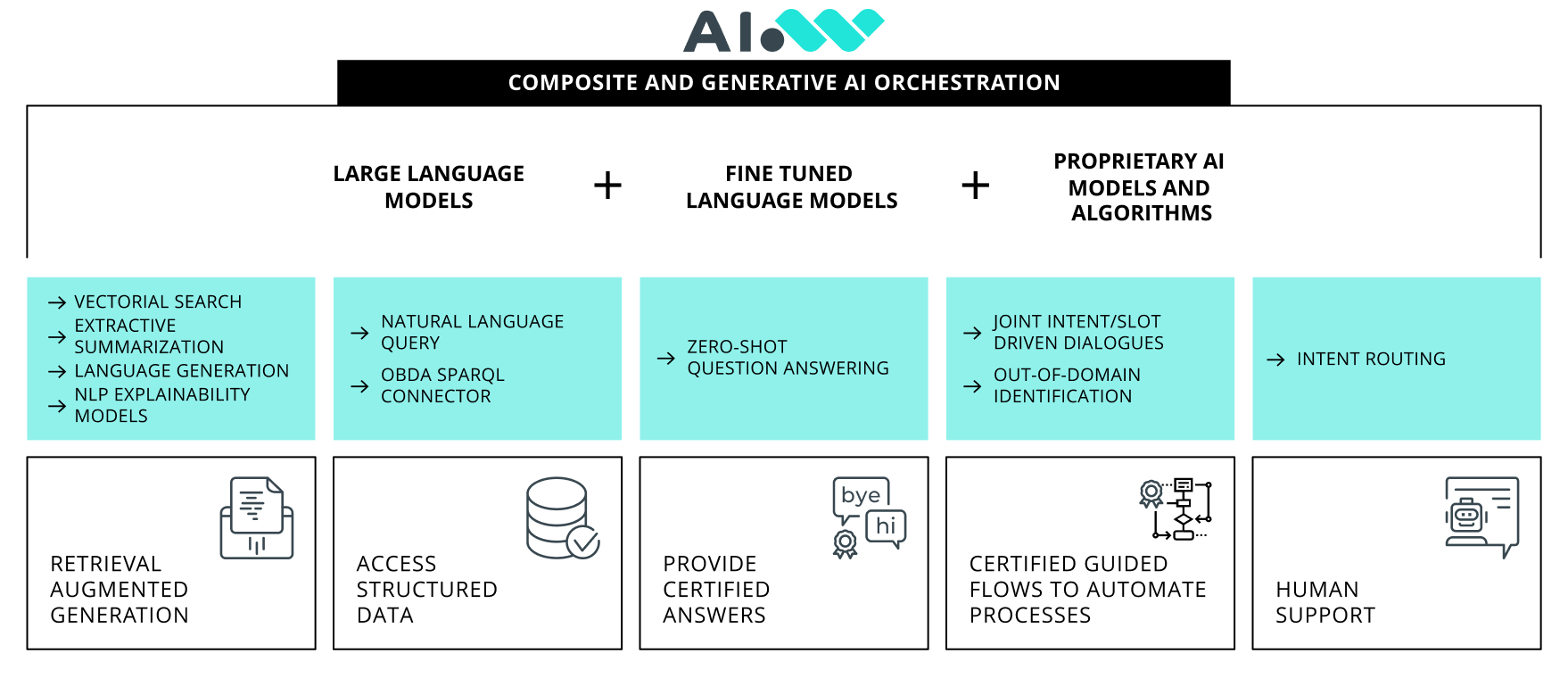 The AI Orchestrator layer is central to the AIWave Composite Generative AI system. It allows to perform AI tasks with various models —individually or in combination— such as LLMs, SLMs, and other machine learning algorithms. It can be operated on-premises and configured for lightweight hardware or specific performance requirements.