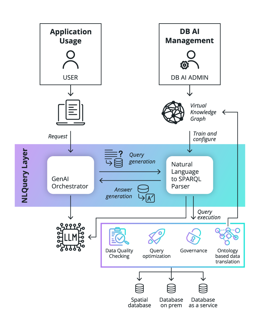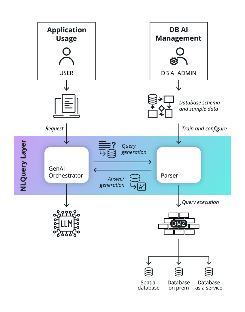 An orchestration layer directs user queries through the LLM, database, and NLU module. Input is parsed into query syntax and executed on the admin-managed database. The database response is then refined by the LLM, merging structured data with conversational clarity for a natural language output.