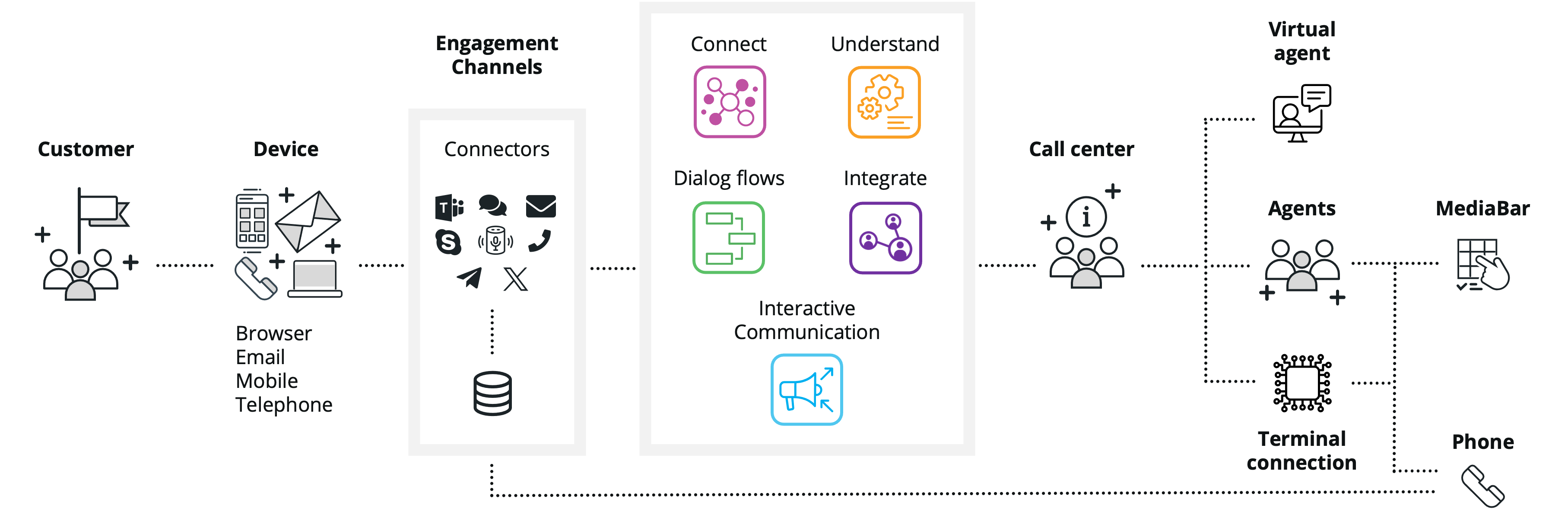 Create consistent, high-quality, interconnected experiences across multiple channels, including voice, chat, and Short Message Service (SMS), IVR, and human operators.